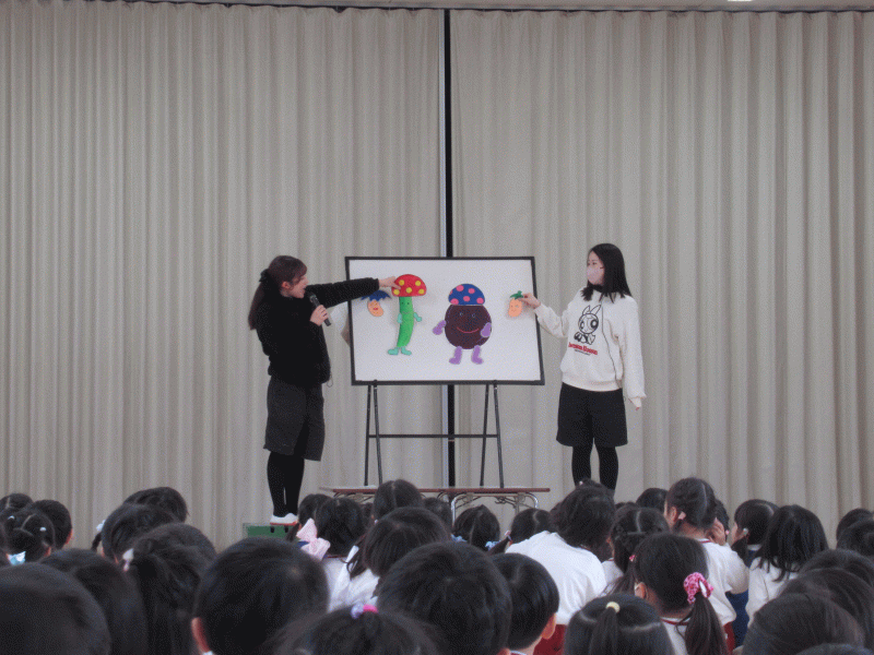 先生たちからのプレゼントは、パネルシアターの「きぬさやくんとべいなすくん」です!