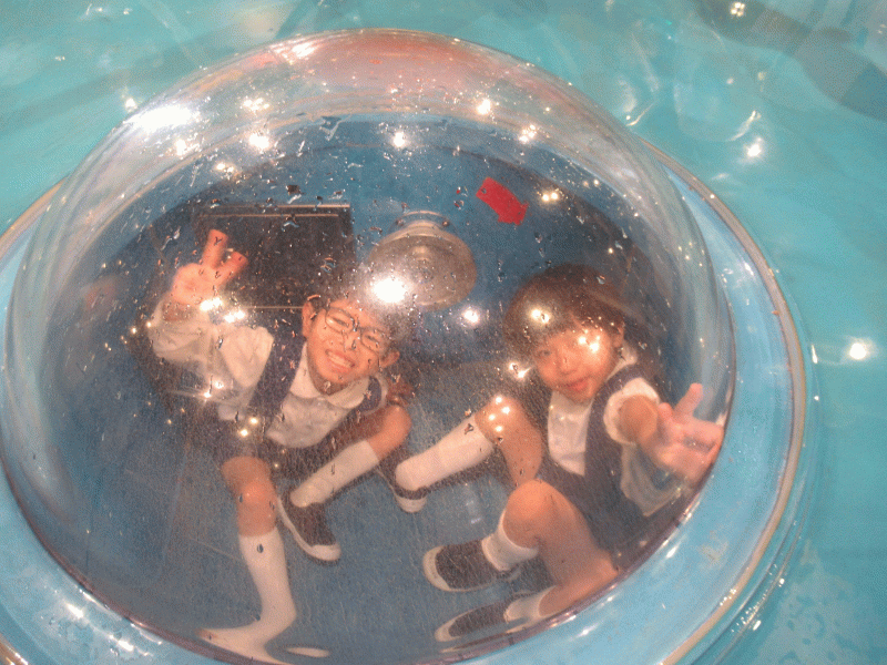 みんなで力を合わせて、甕に水を入れて倒す「じゃぶじゃぶポンプ」ののぞき窓から、子どもたちの笑顔が見えます☆