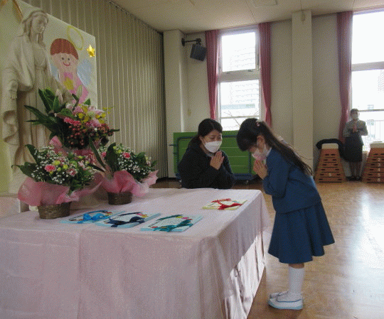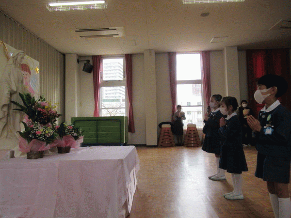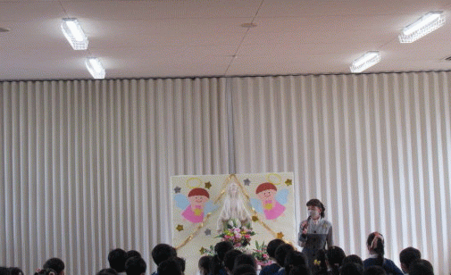 幼稚園でも、遊戯室にて「無原罪のマリア様の祝日会」を行いました。そして、城星学園の創立記念日でもあり、あわせてお祝いをしました。