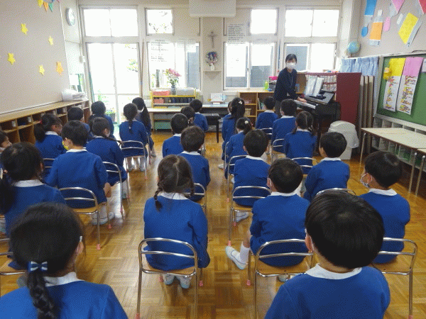 今日は、年長組になって初めての英語・音楽指導がありました!