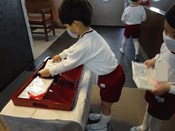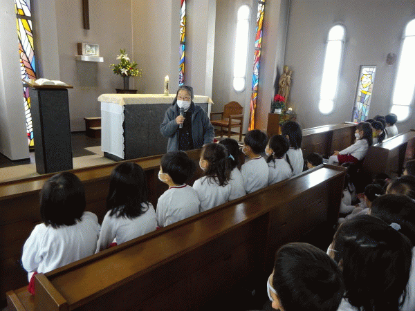 新しい1年が始まり、学年ごとにおみどうに行き、お祈りをお捧げし、みんなのあたたかい心のたくさん詰まった献金をお捧げしました。