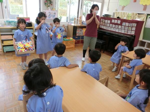 優しいお兄さんお姉さんから、かわいいプレゼント受け取り、嬉しそうにする年少さん★