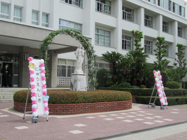6月に入り、先週からお天気が心配されましたが、蒸し暑い一日となり、夏服に袖を通した新入園児のみんなが、正門を通ってマリア様の前へ!!