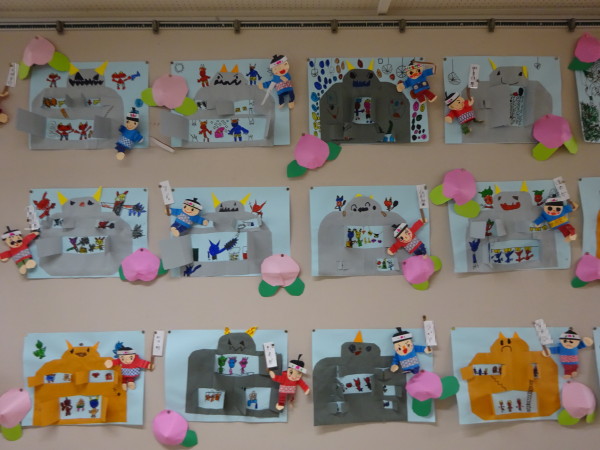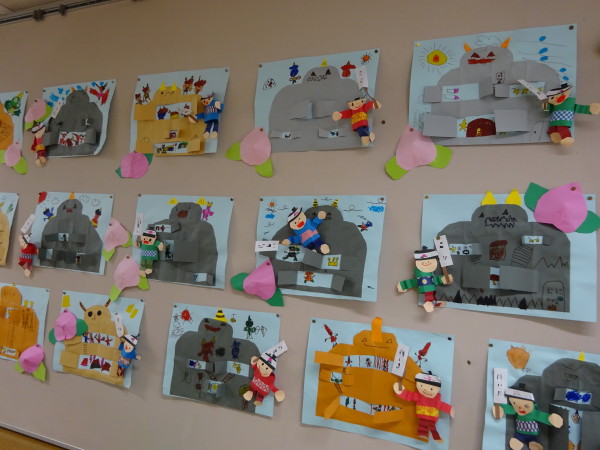 鬼が住んでいた鬼が島を作って、鬼を描いたり、宝物や小判など子どもたちが好きな絵を描きました!!