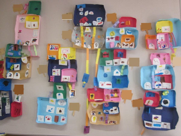 年長組の12月壁面は、立体制作の「100階だての家」です!