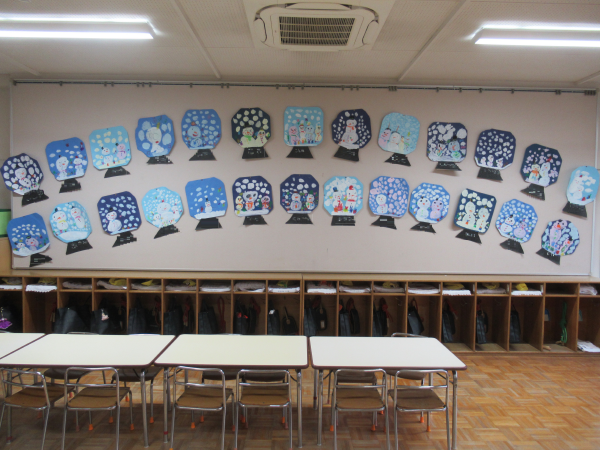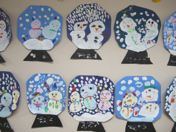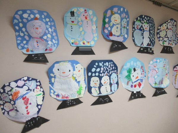 制作では、まず始めに画用紙を切り、様々な色の絵の具で雪だるまをかきました!