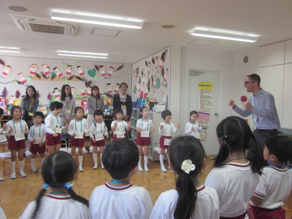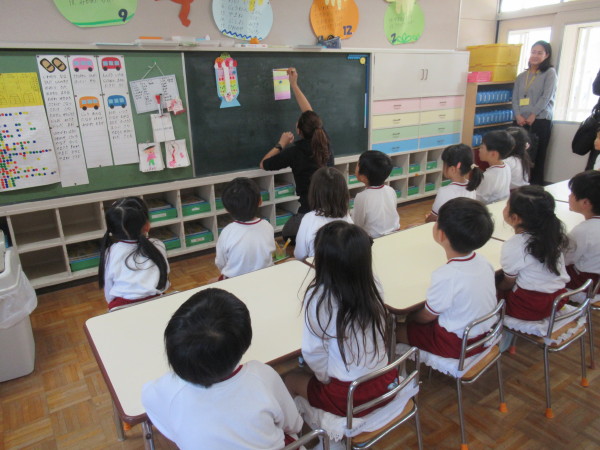 英語では「ハッピー!」と元気よく答えたり、写真を見て曜日や果物、仕事を答えたりなど、歌いながら楽しく英語を学ぶことができました!