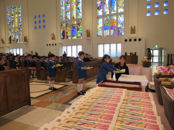 そして、感謝の気持ちを手紙やカードに表して、各クラスの代表がお捧げをしました。