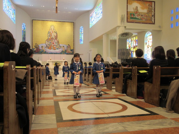大聖堂に子どもたちと年長組の保護者の方が集い、一人ひとりの成長を喜ぶとともに、今まで見守ってくださった神様に、感謝の気持ちを込めてお祈りをお捧げしました。