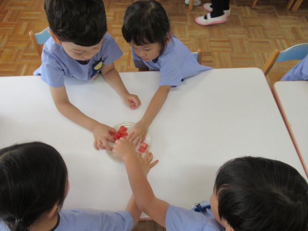 さっそくトマトを小さく切って、みんなで食べました!