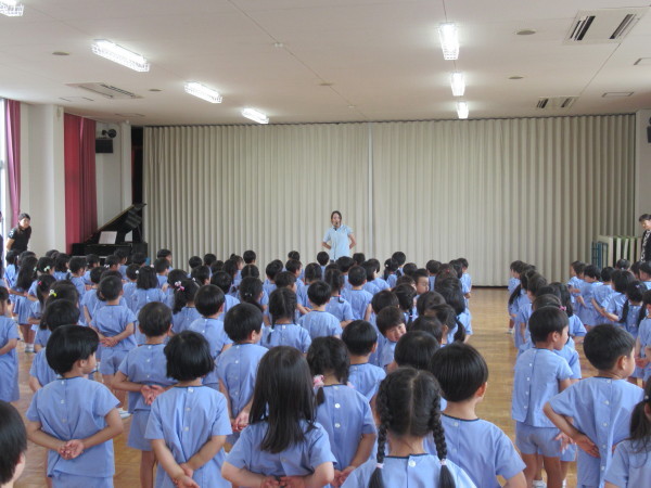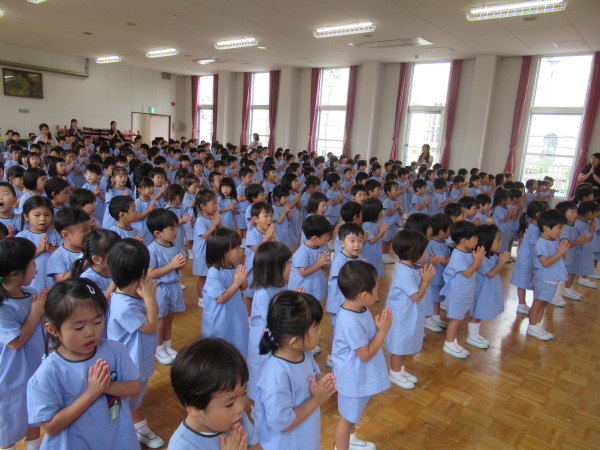 園長先生から、長い夏休みの過ごし方やお約束、「神様は、みんなを見守ってくれているので、お家でもお祈りをしましょう」などお話をしてくださいました!