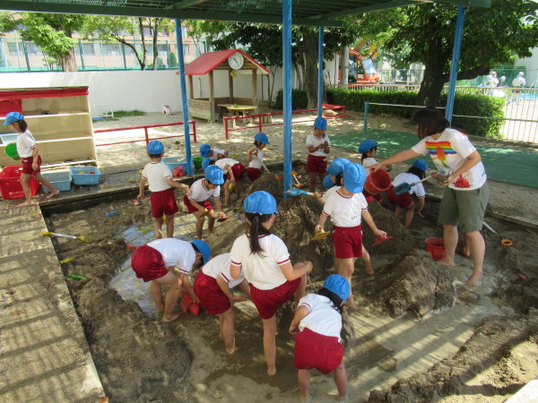 冷たい水や土に触れながら、クラスの友達と一緒に楽しむ様子が見られました☆