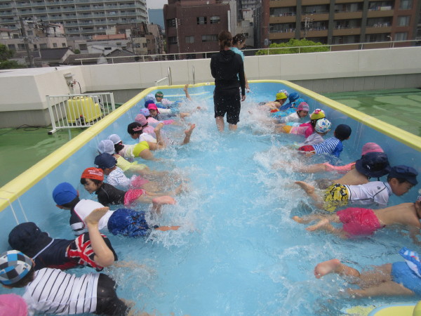 プールでは、顔付けや水のかけあいっこ、バタ足などを行いました☆