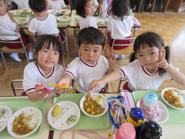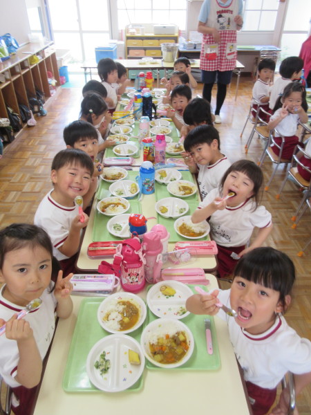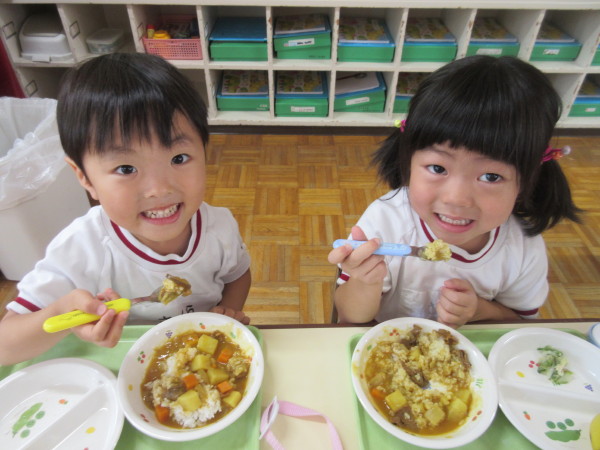 配膳されたカレーライスをみて、「あ、オクラだ!」「星の形してるね〜」など、皆で育てたオクラを見つけて、子どもたちも嬉しそうでした(^^)