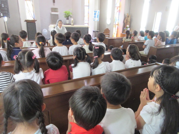 みんなで遊んだ後は、お御堂へ行き、神様にご挨拶をし、田口シスターのお話を聞きました。