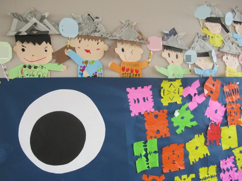 年長組の5月の壁面は、新聞紙で「かぶと」を折って、色画用紙で作った「自分」に被せました!!