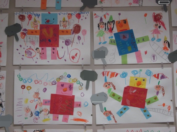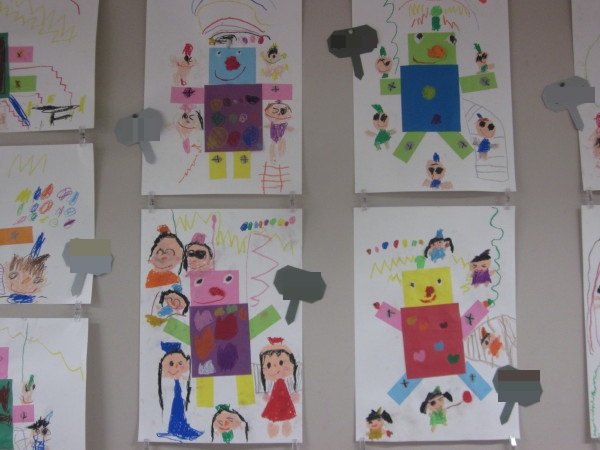 周りには、クレパスではしごや階段を使ってロボットに登ったり、一緒に遊んでいる可愛らしい小人さんをたくさん描いて完成です☆