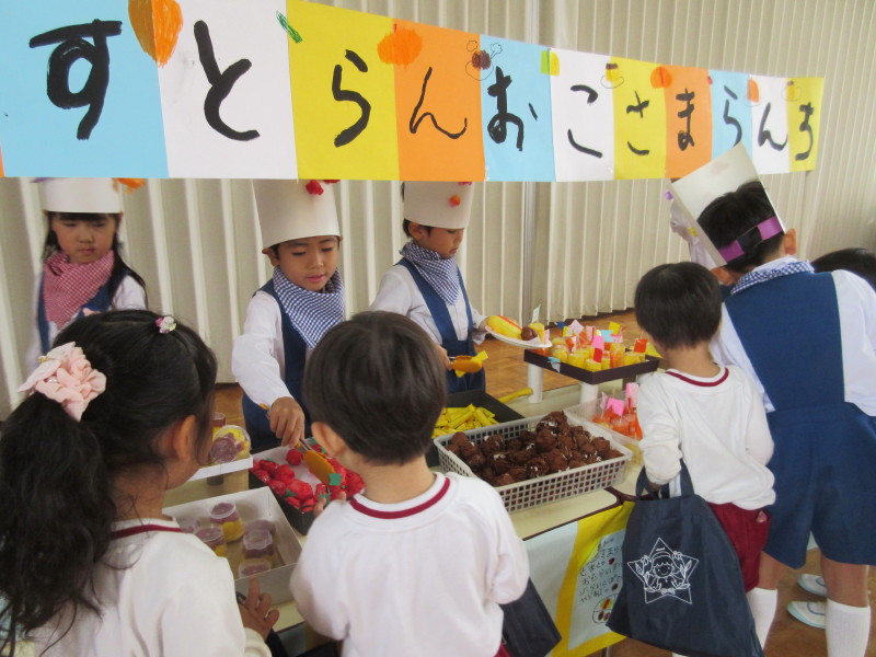 レストランコーナーでは『おこさまランチ』をお客さんの要望を聞きながらお皿に盛り付け、「はい、どうぞ〜!」と渡します♪