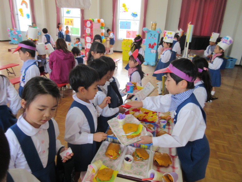 『ハンバーガーやさん』では「いらっしゃいませ〜」と大きな声で呼び込みをしながら楽しそうに売っていました!