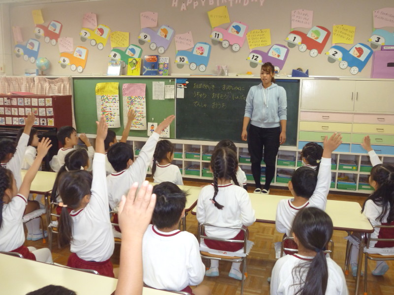 英語では、写真を見て「ハッピー!」や「アングリー!」と元気よく答えたり、歌いながら楽しくダンスをしたり、楽しく英語を学ぶことができました♪