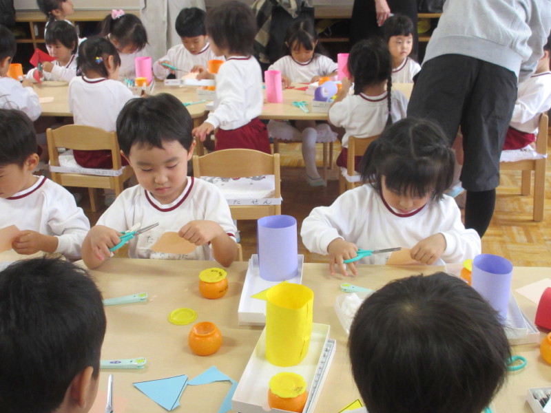 年中組は紙制作[どんぐり村」を作りました。昨日、どんぐり村の絵本を読み、ペープサートを作りながら「明日はお花屋さんを作る!」「大きなお家を建てる」と楽しみにしていた子ども達。今日は、お店屋さんや、動物園、池、公園など様々な物を作っていました☆