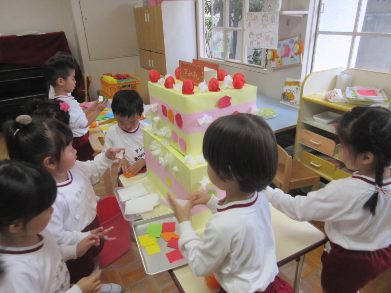 次は、ケーキに生クリームや果物を付け、デコレーションしました♪みんなで協力して、美味しそうなケーキの完成です☆彡最後は、小人からお礼の手紙が届き、子どもたちもとっても喜んでいる様子が見られました(^^♪
