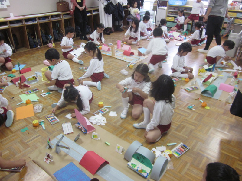 各クラスの個性が出た作品が出来上がり、最後は皆でペープサートを使って、お友達の村にもお出かけしました♪