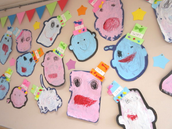 丸いおばけの形を描いて絵の具が乾いたら、クレパスで顔を描きました☆