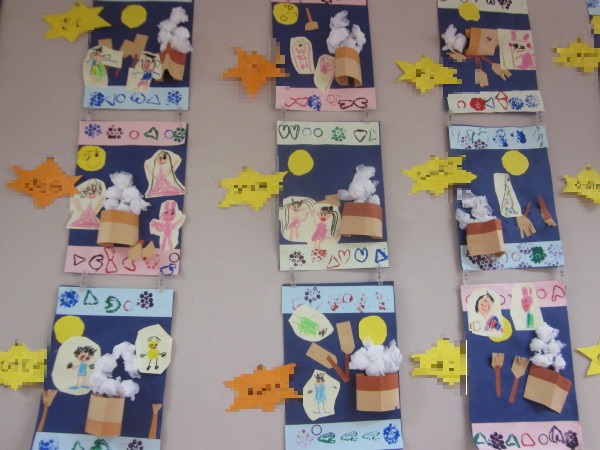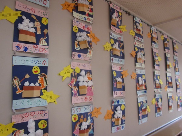 上下は片ダンボールのスタンプで飾り付け♪