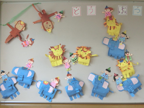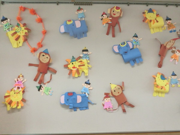 7月年長組の壁面は、“動物サーカス”の紙製作です♪