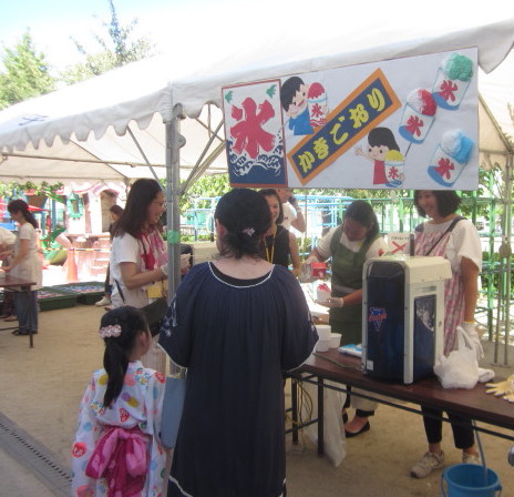 飲食コーナーでは、わた菓子にかき氷、ミルクせんべい、冷たいジュースがあり、おいしそうに食べる子どもたちの姿がありました