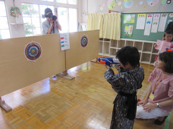 園内では、駄菓子屋さんコーナーにシューティングゲームコーナー、うちわデコレーションコーナーがあり、受付でもらったうちわに模様を描いたり、きらきらシールを貼ったりして、自分だけのオリジナルうちわを作りました。