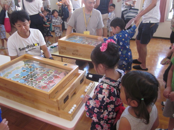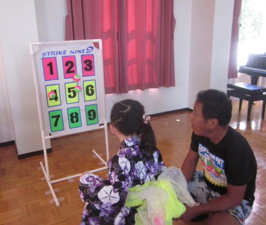 遊戯室では、ストライクナインや輪投げ、スマートボール、魚釣りのコーナーがあり、どのコーナーでも、みんな真剣な表情でゲームに参加し、おまつりを楽しみました。