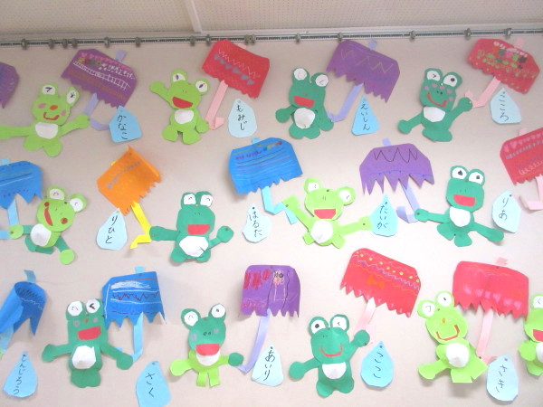 年中組の6月の壁面は「カエルと傘」、窓飾りは「てるてる坊主」です♪