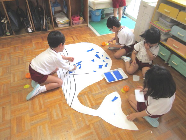 最後に、お友だちと一緒に、ちぎり紙で大きなクジラを作りました(*^。^*)