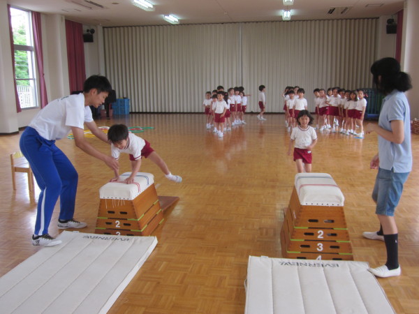 各クラス、順番に対馬先生と一緒に跳び箱をしました。