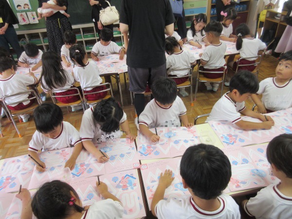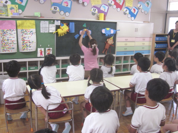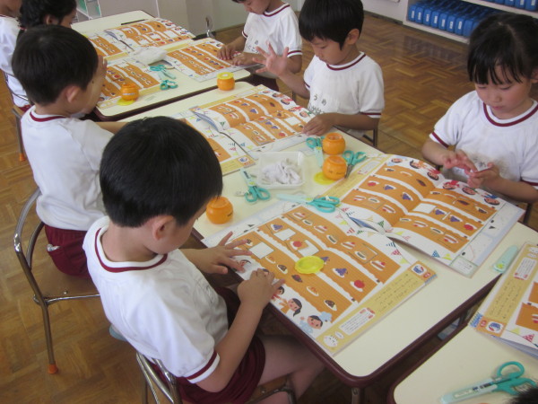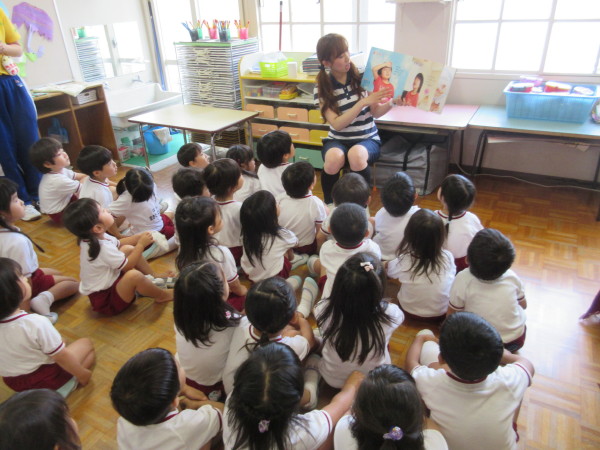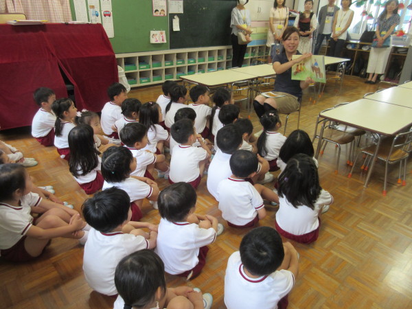 年中組の園開放最終日では、英語・ワーク・絵本『こどものせかい』を行いました。