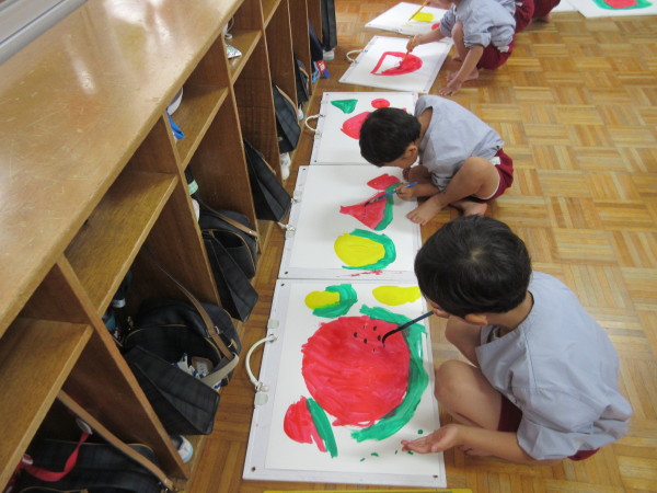 赤いスイカと、黄色いスイカの2種類のスイカを、子どもたちは思い思いの形に描いていました!