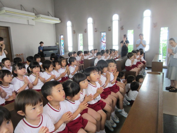 まずはじめに、みんなで聖歌「あの空はどうして青い」を歌って、今日も楽しく過ごせるようにお祈りをしました。