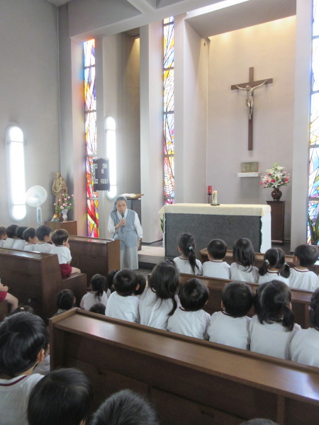 「ここは、神様のお家です。前にはイエス様。ここにいらっしゃるのはマリア様です。」と、おみどうの中を紹介してくださり、「幼稚園や、学園のいろんなところにいらっしゃるマリア様は、いつもみんなのことを見守ってくださっていますよ。」ということもお話してくださいました