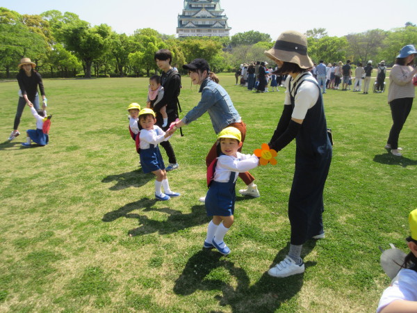 ふれあい体操では、お家の方と手をつないで腕を伸ばしたり、おしくらまんじゅうをしたりしました☆