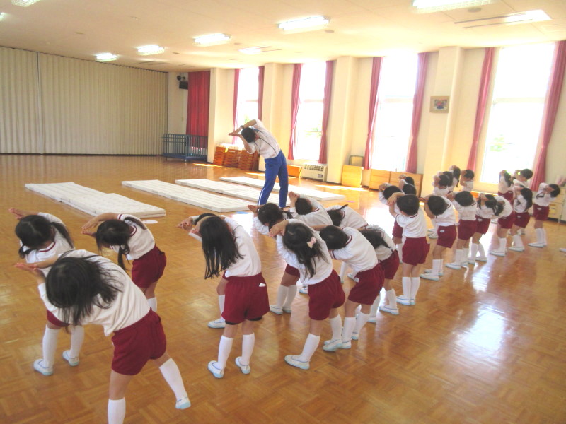 まずはじめに、体育の時間の時のお約束を確認してから、体操をしました。