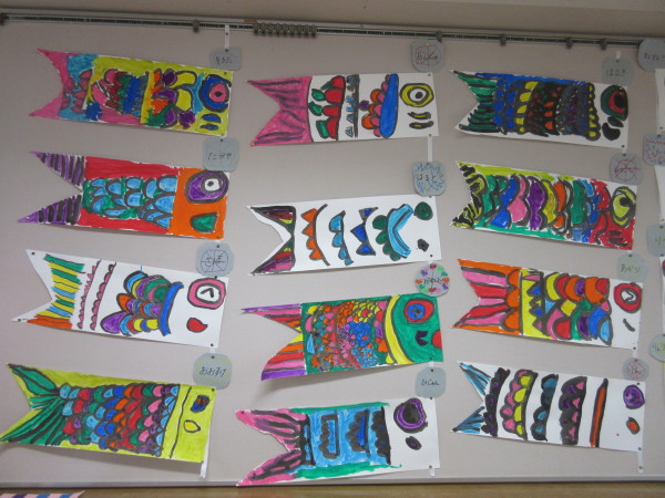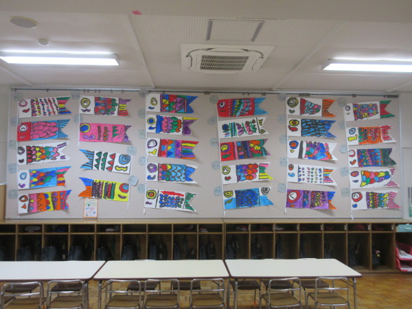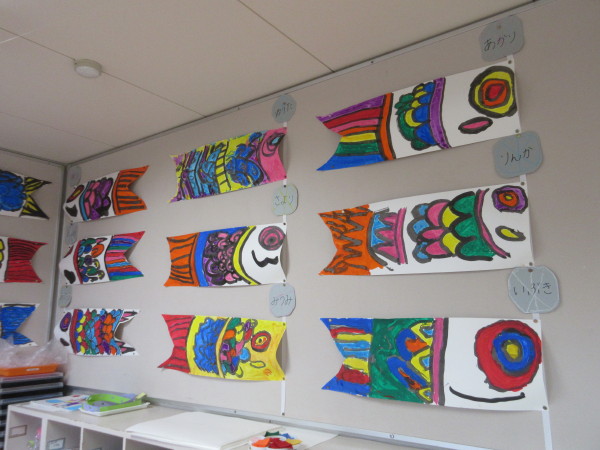 年長組の壁面は、墨絵で「こいのぼり」を描きました!
