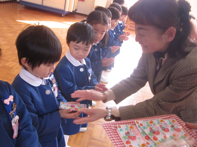 「3月は、暖かくなるのを待っていた木々や花が芽を出し、そして綺麗に咲き始める、そんな月です。また、お別れの季節でもあります。年長さんは、幼稚園や幼稚園のお友達とさようならをして小学校に行きますね。これからも、神様からのおめぐみを大切にして、素敵なお兄さん、お姉さんになってください。」というお話を頂きました!