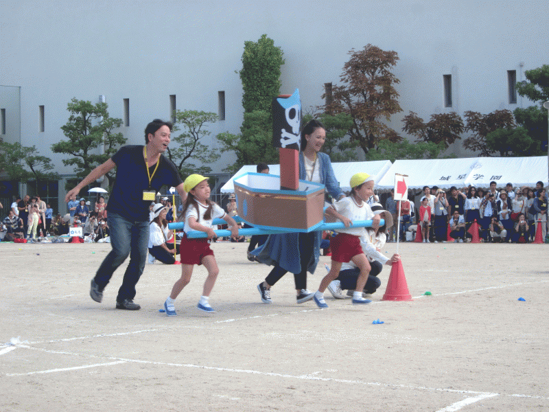 年長組の親子競技では、親子で協力して海賊船を運ぶクラス対抗リレーをしました(^^♪