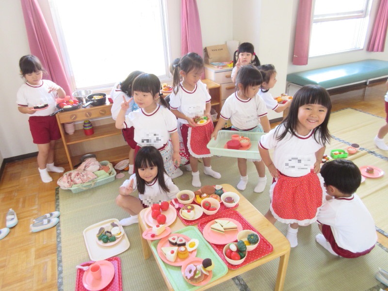 遊戯室で、ブロックやおままごと、カラー積み木で遊びました♪