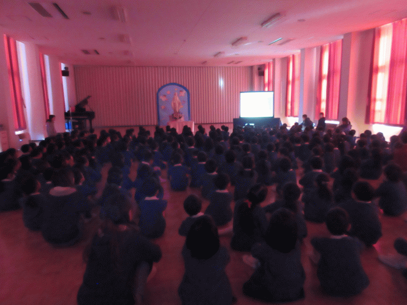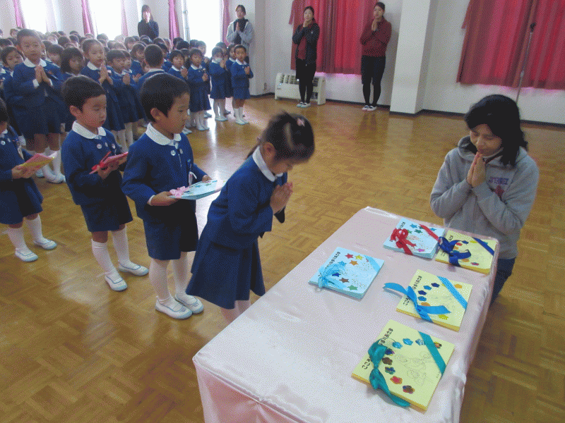 その後、代表の子どもたちが「お友だちのこと」「家族のこと」「世界中の人たちのこと」を思いお祈りを捧げ、「マリア様のこころにちかづけるように、お導きください」と唱え、みんなでこころをあわせてお祈りをしました。
