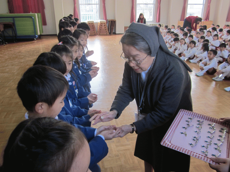 マリア様へのお祈りをお捧げした後、、各学年で目標を決めて毎日取り組んできた徳の花を、代表のお友達がマリア様にお捧げしました。