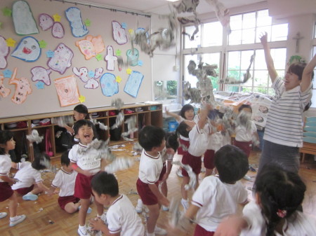 新聞紙を使って、色んな遊びを楽しみました。