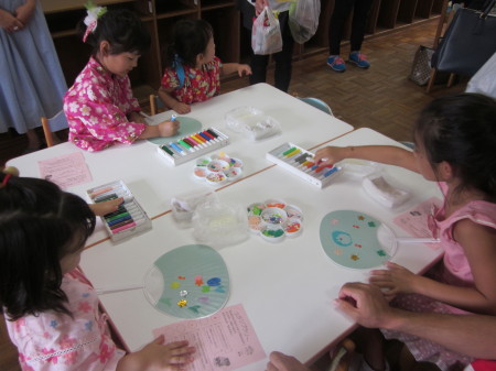 園内では、受付でもらったうちわに模様を描いたり、